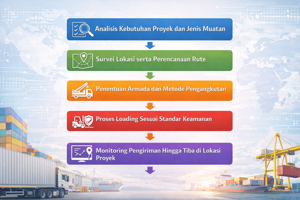 Dengan pendekatan logistik berbasis proyek dan dukungan perusahaan logistik terpercaya, pengiriman material dan alat berat dapat dilakukan secara aman, efisien, dan tepat waktu.